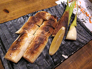We piled on the vegetables. A bulbous onion of some sort was also parked directly in front of us. "Kore wa nan desuka?" (There goes another eight percent.) I'm still unsure whether tamanegi is a specific type or a catchall term, but yeah, I suppose this particular variety did kind of resemble Chop Chop Master Onion. It was trimmed, wrapped in foil and buried in the coals for 10-15 minutes, emerging as a sweet, tender and lightly caramelized roasted onion that practically melted at the touch. Through a convoluted flurry of stammering and pointing (I was into my third shochu at this point, which probably wasn't helping matters), we ended up with a chef's recommendation of makomo dake, young bamboo that was charred and served with salt and yuzu. It was absolutely delectable, surprisingly tender and sweet.
