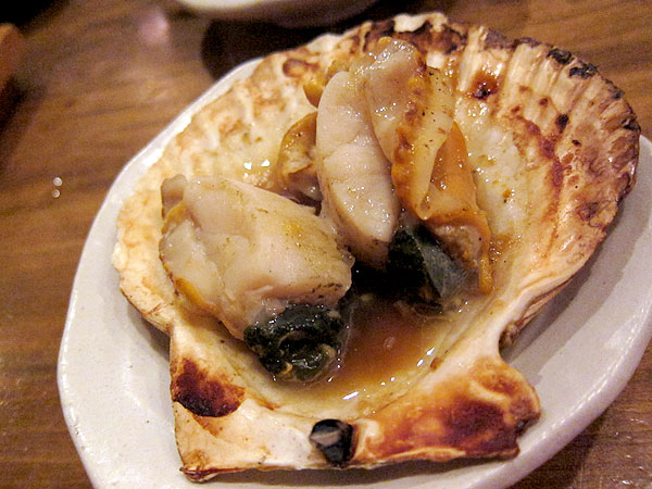 I'm a total sucker for scallops, and hotate is within the scope of my Japanese food vocabulary, so these fellows were next, served atop a searing hot shell that acted as its vessel through the entire cooking process. I'm not sure if the flesh of the scallop ever actually touched the grill, but if it did, it was only very briefly. It spent most of its time protected from direct fire by the shell, cooking and bubbling away in its own natural juices while absorbing the smoke that swirled around it. This received, I believe, no more than a splash of soy, and it probably didn't even need that. This was fresh seafood and smoke, tender and sweet, a little color and char where it had rested against a bare portion of the shell for a while, the muscle served along with just about ever other edible part of the beast. At this point, we were starting to wonder if the entire meal would be this minimal, mostly because we were hoping it would be.