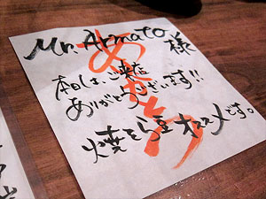 Our hotel had called ahead to hold us a couple of seats, and waiting for us at the counter was a charming little missive, addressed to me, that I wish I could read. I got my name as well as the thank you in red in the background, and that's about it. Conversing with our hosts proved to be no less challenging, though they were warm and boisterous and couldn't have been more welcoming, even if the awkward moments of failed communication were abundant (I blame only myself). The fact that so much of their product was laid out on the counter was a godsend, and before long we were pointing and nodding our way to a lengthy order of items -- fish, flora and a few helpings of shochu -- and before long a beautiful parade of dishes, sent at a lazy, booze-friendly pace, started to arrive.