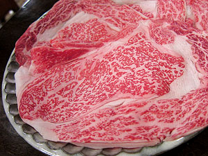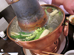 Finally... *finally*... the pot arrives, and rather than the simple stainless job on an induction burner that typify the quick lunch spots, here it's an elaborate contraption of hammered copper, a raised donut-shaped bowl surrounding a chimney nearly three feet tall, a charcoal fire within the base providing the heat. It's needlessly ornate. I can't imagine anything a charcoal heat source brings to the table that an induction burner doesn't, other than various levels of complication in maintaining your heat. But as with so many Japanese traditions, it's as much about the process as it is about the results, and even if they're short on practicality they're usually long on beauty, which is certainly the case here. Finally, we dive in, and while the first round of vegetables cooks, I gently peel off that first paper-thin slice of beef, give it a few quick swishes through the water so that there's a little pink where my chopsticks are holding it, pause for a moment to dip it in the goma-su, and then enjoy a melting mouthful of what's as much beef fat as it is meat, silky smooth, tender and juicy, and completely unlike any slice of cow attainable back home. I savor it -- I'd better, since the stuff probably costs about $15 per slice -- before moving on to some fresh greens, scallions and mushrooms, giving them a splash of citrusy ponzu as they escape the pot. Wait... what's missing... rice! "Gohan, onegaishimasu," I say, exhausting close to 5% of my Japanese vocabulary in one loquacious burst (Kiguchi Sensei's class back in high school was big on kana, not so much on conversation), and moments later I'm reintroduced to the beauty of a bowl of perfectly steamed rice, remembering that it isn't just an accompanying starch, but can be a fabulous dish all its own. So we dip and slurp and moan and don't talk much until each has but one slice of beef left -- naturally, you have to save one slice of that beef for the last taste -- and that last taste is as bitter as it is sweet, because I could eat a week's salary worth of this beef in one sitting and it still wouldn't be enough.
