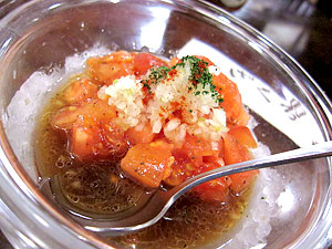 And what better way than taking a lunch break to avail ourselves of some of these amazing ingredients? Zakuro is another old favorite, in the heart of the Ginza strip, specializing in shabu shabu. It's tucked away in the basement of an office building, old-school in appearance with paper screens and a kimono-clad waitstaff, and an air of propriety that's reflected in the food. We started off with a tomato salad, topped with a scant amount of finely chopped onion, heavily dressed with a vinaigrette and arriving in a small bowl encased in ice. The color, though vibrant, was off-putting at first, something I'd associate more with underripe tomatoes -- which I'd never experienced at this restaurant. And this would be no exception. It was ice cold, sweet and fabulous. A clean, fresh start.
