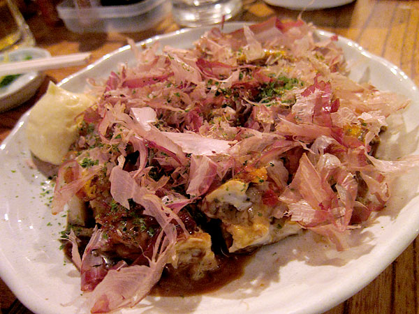 There's a feeling captured so well by the film Lost In Translation, of being dazed, out of time, surrounded by people yet completely disconnected from them on every level, and that's the feeling I had while sipping a beer and fighting fatigue in this dive of an okonomiyaki joint. On my right, a couple that had obviously been carousing all night were getting progressively drunker and drunker and closer and closer. On my left, two tiny young women in formal kimonos(!), hair artfully sculptured and faces carefully painted, were putting away enough food to feed four teenage football players and energetically chatting about something that was obviously very, very exciting. It was a surreal scene, but a surreal scene with okonomiyaki, which thankfully didn't require a whole lot of cultural knowledge to order. I love okonomiyaki, and there's no better time for it than 2:30 in the morning. An egg and batter pancake, in this case packed with vegetables and a shocking amount of bacon, griddled up hot, served alongside a golf ball-sized dollop of Kewpie mayonnaise and topped with sweet okonomiyaki sauce and a pile of bonito flakes dancing and waving in the rising heat. This is booze food, late night fare, big and greasy and sweet and salty and so completely fabulous. I've had better, but this was pretty darn good, and if I had even the slightest idea of the name of the place, I'd note it here for posterity. But it will forever remain a mystery, a place out of time, and I've no doubt that when I return I'll walk the alleys of Golden Gai saying to myself, "Man, I could have sworn it was rigt here." Though disappointing, the evening wasn't a total loss after all. As I stumbled out, I could barely stand and I figured I was unlikely to find a better nightcap than that. I wanted to get a little bit of sleep, anyway. Just one morning left.