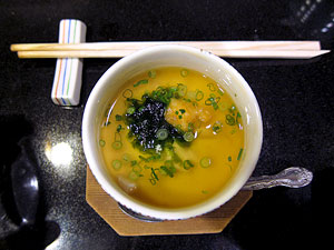 When our server came over to ask if we'd like some chawanmushi, my heart leapt. I love chawanmushi, and was excited to see what it could be in such capable hands. Chawanmushi is a steamed egg custard, usually seasoned with dashi and perhaps soy and mirin, and it exceptionally delicate in both flavor and texture when done well. This was more than done well, bordering on ethereal, a perfect texture and subtle dashi flavor yielding a special surprise below. Our morning's discussion proved to be serendipitous, as this was shirako chawanmushi. I'd get my first taste of cod sperm. Had I known I'd be tasting it later in the evening, I would have gotten a good photo of the raw ingredient in the morning, but there's a good image here (even though I hate to indirectly endorse the "Oooooooo, these foods are bizarre!" approach). While I realize it's a shudder-inducing thought to many (hey, the older generation of Japanese feel the same way about us eating cheese), it's rather innocuous on the other side of the mental leap. Delicate is the operative word, with an ever so slightly briny flavor and soft texture that couldn't be more perfectly suited to chawanmushi. I really, really enjoyed this.