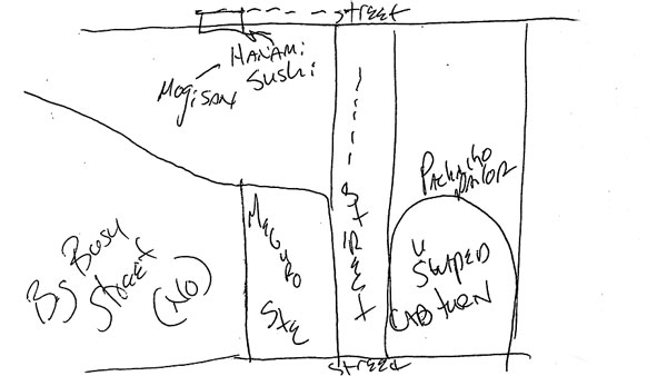 By the time dinner rolled around, I'd decided it was time to embark on a quest. My friend Josh, of Posh Restaurant, worked for a few years in Japan. So before my departure, over whiskey one evening, he grabbed a table check, flipped it over and began to map out the location of his favorite sushi bar in Tokyo while excitedly describing the directions.