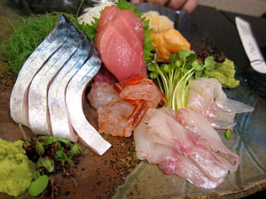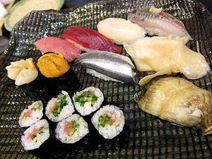 What followed was fish, of fabulous quality, skillfully prepared and impeccably presented. I did an extremely poor job of taking notes, and I'm left more with impressions than specifics, but I can state that yes, it tasted as wonderful as it looks. I do recall some deep and complex mackerel, fabulously light and sweet shrimp, and chutoro with a flavor far more robust than it looked like it should have had. This was followed by a round of sushi of similar excellence, including more dynamite mackerel, sweet magurozuke, and rich toro. A small roll made an appearance -- negi hamachi, I believe? -- sharp scallions accenting smooth yellowtail. And a man after my own heart, Mogi-san included both uni and hotate, both so fresh that they sang with natural sweetness. The two plates constituted a stunning array of raw fish, and all the more impressive was that it was coming from what could have been just another neighborhood joint. Either Josh found himself a gem, or this is just how it is in Japan.