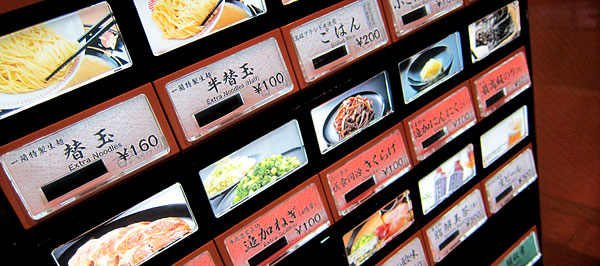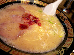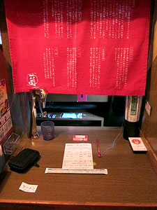 Ichiran is one of the ramen stalwarts that has name recognition in the States. Part of this is, no doubt, due to the running gag that has become the New York outpost, on the verge of opening for more than four years. But while Ichiran's soup is widely praised, what seems to generate ink is the way it embodies cultural quirks, and leads people to smile, shake their heads and think "Only in Japan." The experience starts out front, where a coin and bill op vending machine pictures the menu in full color buttons. You select what you'd like, insert some coins or bills, and receive a small paper ticket. You then proceed inside, where a diagram of the restaurant lit with color-coded light bulbs indicates which seats are taken, which are vacant, and which are in the process of being cleaned. The reason for this is that every seat at Ichiran is a private booth of sorts, separated from its neighbors by wooden partitions, and hidden from the kitchen by a small curtain, save for a few inches at the bottom where food can be passed through. When you sit down, waiting for you is a plastic cup and personal water dispenser, chopsticks, some assorted Ichiran literature, and most importantly a ballot whereon you can customize your bowl -- firmer or softer noodles, richer or lighter broth, heavier or lighter garlic -- before pushing the red button that will summon an attendant to take your ballot and ticket. Of course, you never see more than this attendant's hands and hear his disembodied voice. Other accounts I'd read led me to believe that Ichiran was silent as a tomb, save for the slurping of others in the room. But a synthesized shamisen plinking out Top 40 tunes makes for an even more surreal atmosphere, and the attendants, though never fully seen, are quite vocal and not shy about their volume. A few minutes later, two disembodied hands set your bowl in front of you, the voice says something very earnest and gracious, the attendant slides down a shutter, and it's just you and your ramen.