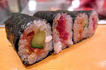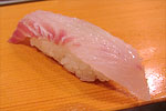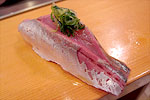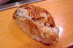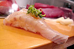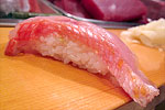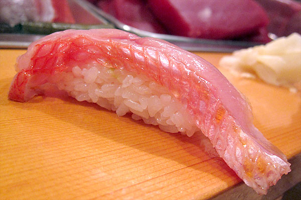 There's a thin slice of tai, red snapper, that manages to be both far more tender and far more flavorful than what I've come to expect. There's a slab of delicate and sweet kinmedai, a bit of its skin left behind, like an iridescent racing stripe. I adore uni, but there's uni and there's uni, and this is the latter. Next is sawara, a luscious sort of Spanish mackerel, with a hint of fishy character that stops short of plunging into funk. Before the hokkigai hits the counter, the itamae winds up and applies a sharp *SMACK* to its surface, which causes its feathered edges to undulate like a little wave, its freshness duly demonstrated. Aji, horse mackerel, is usually enough to put one off mackerel for life back home, but here that fishy funk is, instead, a complex depth, its deep flavor set off by the sharp sting of shredded scallion. At the opposite end of the spectrum is tamago, a block of dense, sweet omelet, warm and almost creamy. Looking almost comically like a small brain, an entire school of tiny shiro ebi, white shrimp, are packed together, riding the rice, and they go down sweet and sticky. Magurozuke dodges lean tuna's plainness by taking a bath in a soy-based marinade, adding sweetness, depth and interest to what is usually an unremarkable piece of fish. Growing up, anago was the chewy eel choice, but here it's creamy bordering on milky, a level of freshness that I've not previously encountered. Though it could be considered pedestrian next to the rest, there's something comforting about a small roll, nori on the outside, tuna and cool, crisp cucumber within. When it comes time to select my bonus piece, I don't care that hotate is one of the cheapest on the menu. I can't get enough of raw scallop, and if it were all this good, I'd be that much more insatiable.