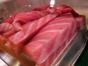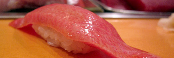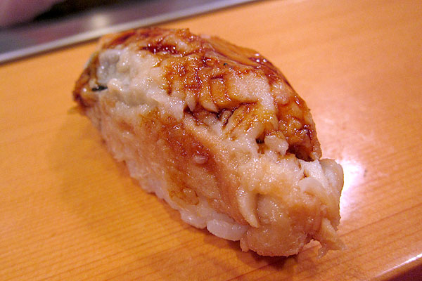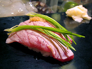 I'm a sucker for amaebi, sweet shrimp, and it's so dependent on freshness (as if the rest isn't) that I want to have a couple of pieces before heading back. That raw spot prawn flavor, sweet and... almost starchy tasting?... it's difficult to describe. But it satisfies. What I'm really after, however, is the aburi toro, a piece of fish that I've been anticipating for a long, long time. The concept is simple enough. A slice of fatty tuna is set atop the rice, dusted with salt and then torched before, in this case, being topped with fresh chives and a spot of ginger. But this belies its genius when it's on, the fat from the toro quickly melting and sizzling, creating a kind of salty slick glaze that coats the fish as well as your tongue when you bite. I think I ate twenty pieces of this stuff across three visits on my last trip, it made my Deliciousness of 2006 and has haunted me for every year since. To say that I'm vibrating with anticipation would be a gross understatement. And yet when it's set in front of me and I finally get the taste I'd been craving for years, I'm... extremely disappointed. I'm not sure why. The richness isn't there. The sizzle isn't there. The salt isn't there. I mean, all of those components are present, but the magic is gone, perhaps illustrating how a subtle touch can make such an enormous difference in a dish that seems dead simple. Though it's been a long time, I'm certain it isn't me. It's the fish. Deflated, I pay the tab and head back out to the market.