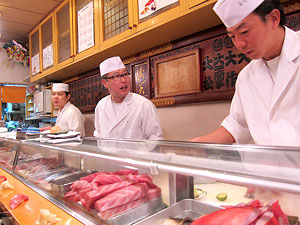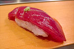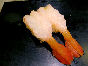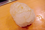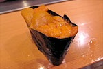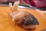 Sushizanmai is Sushi Dai's opposite, a local chain in the shopping area just outside the market proper, where all manner of foodstuffs that might conceivably be paired with fish are sold. It's a large restaurant, kind of flashy, with a hawker out front pulling people in off the street (something that probably would have kept me away on previous visits). There's a large bar, but the rest of the room looks like it could seat close to a hundred, mostly empty at this early hour. In contrast to the boisterous late night crowd I remember from visits past, at this hour the counter seats a few grizzled workmen, tended to by a small cadre of equally grizzled itamae, most of whom look like they've been doing this four decades or more. I'm not looking for much, but there are a couple of choice pieces I need to have before calling the morning done.