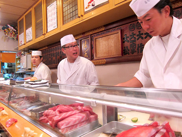 Twenty-one is the answer, at least on this particular dark, frigid morning in the world's largest fish market. And with only twelve seats crammed into a restaurant the size of an Escalade, that means I'll have to wait until the second turn. Bummer. Still, there are worse places to stand around killing time. Tsukiji's just hitting its stride at this hour, and even the outskirts of the market are bustling. Shopkeepers set up for the day across the narrow aisle, grizzled truckers grab some breakfast. a cup of coffee and a smoke at the shop next door while their rigs are being loaded, carts of fish come rolling through as wholesalers take their purchases back to small processing houses to prep them for sale. One of the proprietors of Sushi Dai comes walking through, checking to see whether we'll be selecting the smaller set menu or larger omakase, while handing out scalding hot cups of green tea to the shivering folks standing in line. I can't possibly agree more with the cup's sentiment, nor with its contents. Though I'm the only foreigner in line (now pushing 40 deep), it seems that there's some kind of student group in front of me. Domestic tourists from another city, perhaps? I understand Sushi Dai attracts quite a bit of them. Mercifully, Sushi Dai is a no-frills establishment that does little more than feed you, and half an hour after the doors open, folks from the first seating start filtering out. It can't have been more than an hour when I'm finally beckoned inside.
