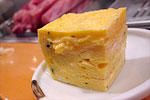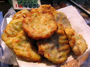 I resolve to nab a little street food before returning to the hotel. Giant blocks of tamago filled with all manner of ingredients seem to be popular, but I'm not quite feeling that. Another stand sells two dozen varieties of onigiri, the fillings within the triangular packages of rice identified by colorful stickers on the plastic wrap encasing them. Another one of the recs from my enormously helpful reader is a tempura place just a couple of blocks away. I don't have high hopes at this early hour, but so many businesses in the area cater to people whose workday is just ending that I decide to check it out anyway. Sadly, it's closed. But across the way there's another street food vendor selling some manner of seafood pancake. I've seen this before, but I don't know what it's named, and I figure it's time to try one. It's a mix of seafood, primarily shrimp, blended into a thick paste, mixed with sliced scallions and some other seasonings, and fried into a dense, chewy, kind of oily puck, the crudeness of which belies its deliciousness. After a morning packed with delicate, raw seafood, it seems kind of brutish to end my visit to Tsukiji with this. But I don't care, because it's completely fabulous. I munch contentedly while walking back to the hotel. Streets that were completely deserted a few hours ago are now packed with people heading to work. The city's waking up. But I'm going to go grab a couple hours of sleep.