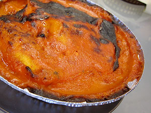 Another dish on the 45 minute list is the Flying Jacob, and if you'd served me this dish and asked me to guess its ethnicity, I never in a million years would have come up with Swedish. A recent addition to the culinary lexicon (most sources peg its creation to the '70s), my first thought upon tasting it was that I have no frame of reference for something like that. Another casserole, this one's composed of chicken, bananas and peanuts, smothered in a sour cream sauce that's spiked with curry and commercial tomato-based chili sauce. I mean, really, where and when does something like this come from? A Swedish air freight worker in the '70s, apparently. And though there's something completely haphazardly over the top about it, as if its invention were either chemically induced or the love child of a voracious appetite and an almost bare pantry, it's oddly compelling, a freakish cross-cultural combination of sweet, tart and spicy that I have a very, very hard time putting into context. But I know I really like it.