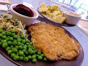 Clearly, this fare isn't hearty enough, so almost all of the entrees are served with a standard complement of sides. These start with a single side dish, which may as well be called the potato dish since five of the six offerings feature them. French fries are unremarkable, but rösti is a respectable preparation of the Europeans' version of hash browns, though, to my personal dismay, more tender than crisp. Creamy dill potatoes are tender and warm and simple and a perfect accompaniment to just about anything on the menu. You also select three from a lengthy list of "side salads" that includes, in part, a lightly creamy beet salad, simple sauerkraut, and a really exceptional herbed cole slaw that's notable for how successfully it keeps the focus on the vegetables rather than the binder. It's a seriously killer slaw.