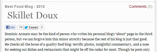 Thing is, writing a blog isn't like posting on a community board that thrives on interaction. It sometimes feels like shouting into the void. Is anybody reading? Does anybody go to the places I write about? Do they like them? Who knows!? There are days when I think I'm spending hundreds of hours every year doing nothing but gazing at my navel, and if that's the case, no problem... as a journal, this blog means something to me and that's plenty. But there are days when I think that maybe I can do a little something to contribute to the greater community. And when the Phoenix New Times staff sees fit to name Skillet Doux the Best Food Blog of 2012, it's definitely one of the latter.