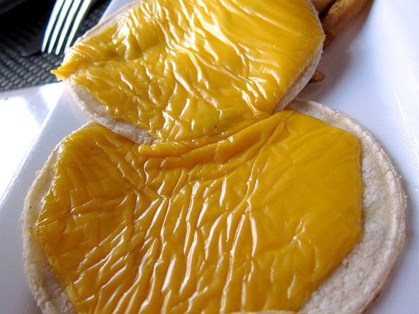 Is this a cheap shot? I'm not the one who served the "cheese crisp" you see pictured here. Which isn't to say that lunch at Kitchen 56 was all bad. The calamari was bad. It was coated with cornmeal, deftly fried and tossed with cabbage, and that's all fine and good if not for a cloying, one-dimensional sauce, liberally applied. I'm not opposed to peanut butter as a shortcut to peanut flavor in a sauce. It's peanuts and sugar, and I see no reason why the fact that they're pre-combined should make any difference. But there's a difference between adding peanut flavor and making a sauce that tastes like slightly thinned-out peanut butter. The Burger Deluxe wasn't bad! Flavorful and juicy (if a step past where I ordered it) with onion marmalade, fontina and sautéed mushrooms, I'd happily eat it again, even if it isn't enough to make Kitchen 56 a burger destination. And the fries could have used a little more crisp, but they were fresh-cut and had nice flavor. When you decide to humor your progeny with a cheese crisp off the kids' menu, however, and get a barely warmed tortilla with a slice of processed cheese on top, it seems like a good opportunity to point out that just because kids have inexperienced palates doesn't mean they want or should be fed lazily-prepared crap. Seriously, guys, this is just embarrassing.