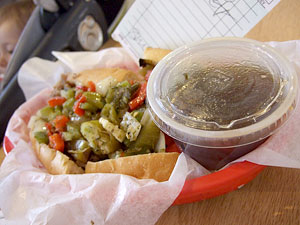 And partially by means of apology, I went back to give them a second shot. It's true that even the best Italian Beef joints sometimes have consistency issues, and I figured that in light of a strong buy from somebody who calls herself "fry girl," I'd better give it one more go. And I'm upgrading my assessment! But not much. The beef I had today was, indeed, leagues better than the one I had the first week of January. But it's still a pretty lousy beef sandwich. The strongest point on this pass was the beef itself which, though not roasted on-site, was perfectly edible. Far from the peak of beefiness, tender if a little dry, but of decent run-of-the-mill quality. (As a side note, there are some pretty good beef stands in Chicago that don't roast their own, but it's a steeper hill to climb, and the best do it in-house.) But really, the rest was so very, very wrong.