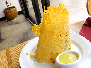Roots are pretty much all there is to the elote callajero, a straight-up traditional rendition of one of the humblest of Mexican street foods, corn on the cob grilled to a sweet char all the way around, slathered with a lime mayonnaise, rolled in cotija cheese and sprinkled with smoked paprika. It's a reminder that sometimes the best preparations are the simplest. Done perfectly and served too hot to eat, I didn't have the good sense to give it a minute or two to cool. Three days worth of a burned mouth to get at it 90 seconds sooner? Fair trade. On the opposite end of the traditional spectrum is the chicharrón de queso, which could best be described as chef's spoils converted into a dish. Ever broiled something that was topped with shredded hard cheese and feasted on the bits that melted over the side and crisped on the bottom of the pan? That's what this is, except it's the entire pan, melted and crisped, rolled into a tower while still supple, and served with a tart aioli spiked with aji amarillo. "Chicharrón" is used in a rather loose and poetic fashion, and aji amarillo is probably more closely identified with Peruvian than Mexican, but who cares when the results taste good?