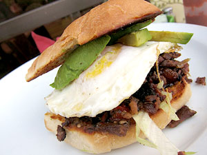 The only thing I tasted that didn't quite get my juices flowing was the much-beloved (in foodnik circles, anyway) naco torta. It's a slight variation on the carne asada torta, I believe the only difference being the addition of two fried eggs. But even a glorious runny egg can't keep me from not quite feeling the value at $10, which isn't to say that I think it's overpriced. It's just that I've gotten the same charge out of $5 tortas in more downscale joints, and recently. Part of it may stem from the fact that this one just felt overly sweet to me. Which is strange, because the tacos, made with (I think) the same meat, didn't. But I still might even get it again. This definitely falls into the "if this is your weak link, you're doing pretty damn well" category. And it was assembled with enough care that I'm willing to wager the other tortas will hit big.
